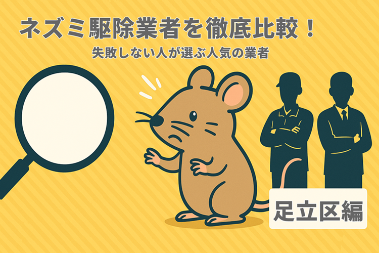 足立区でネズミの被害に悩んでいませんか? 天井裏の物音やフンの発見は、すでに侵入されているサインかもしれません。 ネズミは繁殖力が高く、放置すると配線をかじったり、食品を汚染したりと被害が拡大します。 そのため、早めの駆除と再発防止対策が欠かせません。 この記事では、足立区でネズミ駆除をする場合の費用相場や業者選びのポイント、見積もり時の注意点まで、初めて依頼する方でも失敗しないための情報を徹底解説。 足立区対応のネズミ駆除業者で、特に口コミ評価が高く、対応力に優れた業者を6社厳選して紹介します。 安心し ...